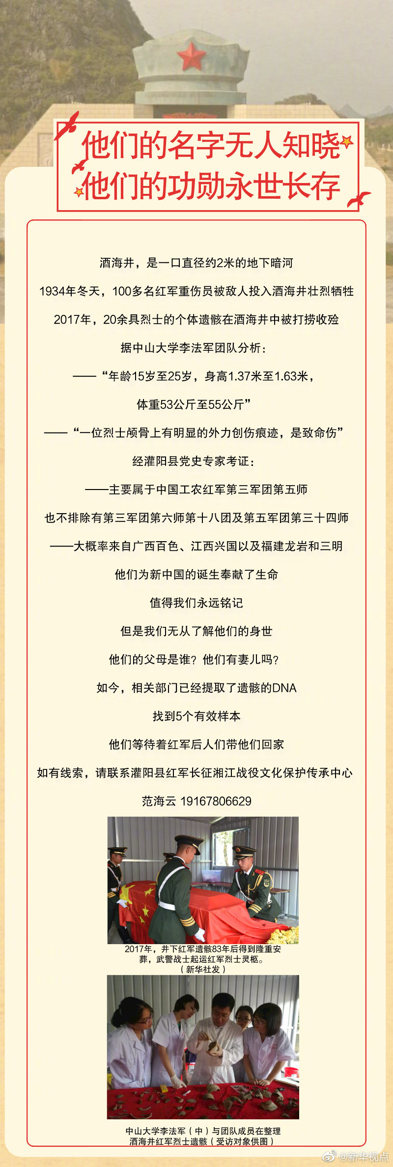 湘江战役是中央红军长征以来最壮烈的一战,数万红军战士血染湘江两岸。在湘江战役新圩阻击战中,百余位红军烈士被投入酒海井壮烈牺牲。2017年,20余具烈士遗骸被打捞出来。经专家鉴定,这些红军年龄小的只有15岁,大的25岁。他们为新中国的革命事业奉献了青春。目前相关部门已经提取了遗骸的DNA,但是缺少可以比对的样本。希望正在寻亲的红军后人们能够和我们联系。戳图了解详细信息。(记者:王军伟、何伟、王悦阳)