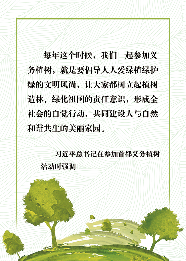 2日,习近平总书记参加首都义务植树活动时强调,每年这个时候,我们一起参加义务植树,就是要倡导人人爱绿植绿护绿的文明风尚,让大家都树立起植树造林、绿化祖国的责任意识,形成全社会的自觉行动,共同建设人与自然和谐共生的美丽家园。