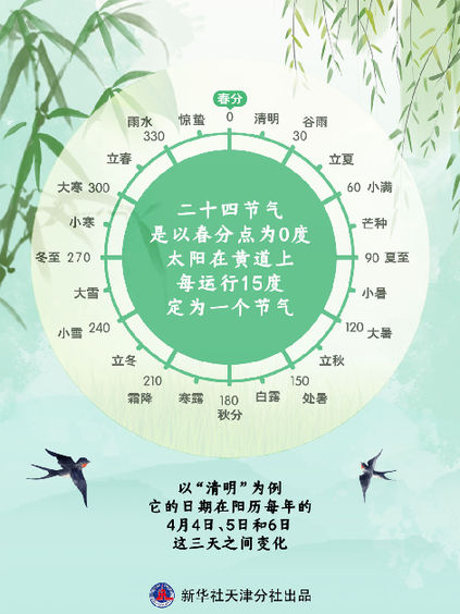 中国天文学会会员、天津市天文学会理事赵之珩介绍说,二十四节气的划分,起源于黄河流域,是中国传统历法的重要组成部分。最初的二十四节气是把一个回归年(365.2422天)的日数等分成24份。自清代开始,定以春分点为0度,太阳在黄道上每运行15度定为一个节气。每月会有两个节气,其中,月首叫“节气”,月中叫“中气”。上半年的节气发生在阳历每月的6日或21日左右,下半年的节气发生在阳历每月的8日或23日左右,上下相差不了一两天。以“清明”为例,它的日期在阳历每年的4月4日、5日和6日这三天之间变化。