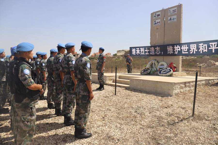 2018年7月25日,在黎巴嫩南部靠近以色列边境的希亚姆镇,中国赴黎维和部队官兵代表在纪念碑前悼念烈士。2006年7月25日,以色列空袭希亚姆,联合国军事观察员哨所被击中,包括中国军人杜照宇在内的4名联合国军事观察员壮烈牺牲。新华社发(蒙卓霖摄)