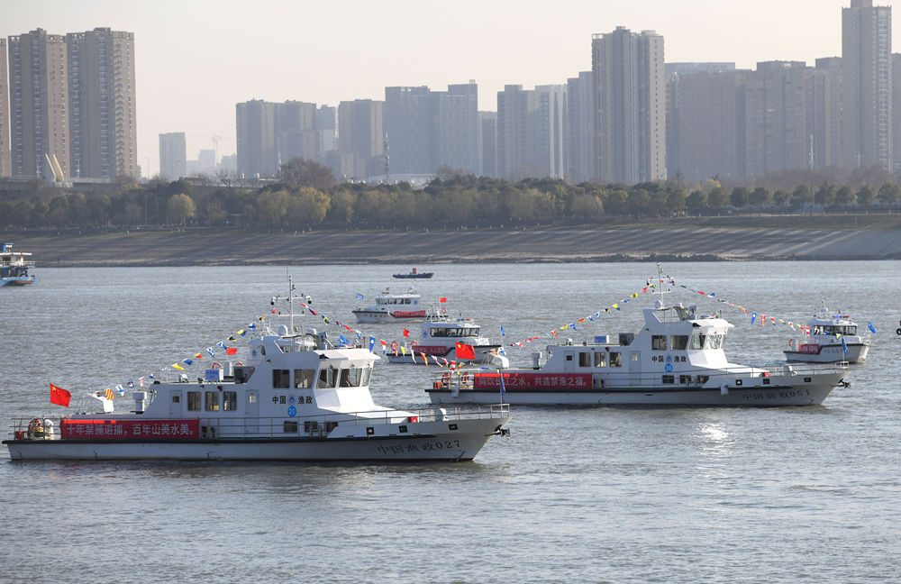 2020年12月31日,在长江流域重点水域“十年禁渔”全面启动仪式现场,渔政执法船队从长江武汉段江面驶过。新华社记者程敏摄