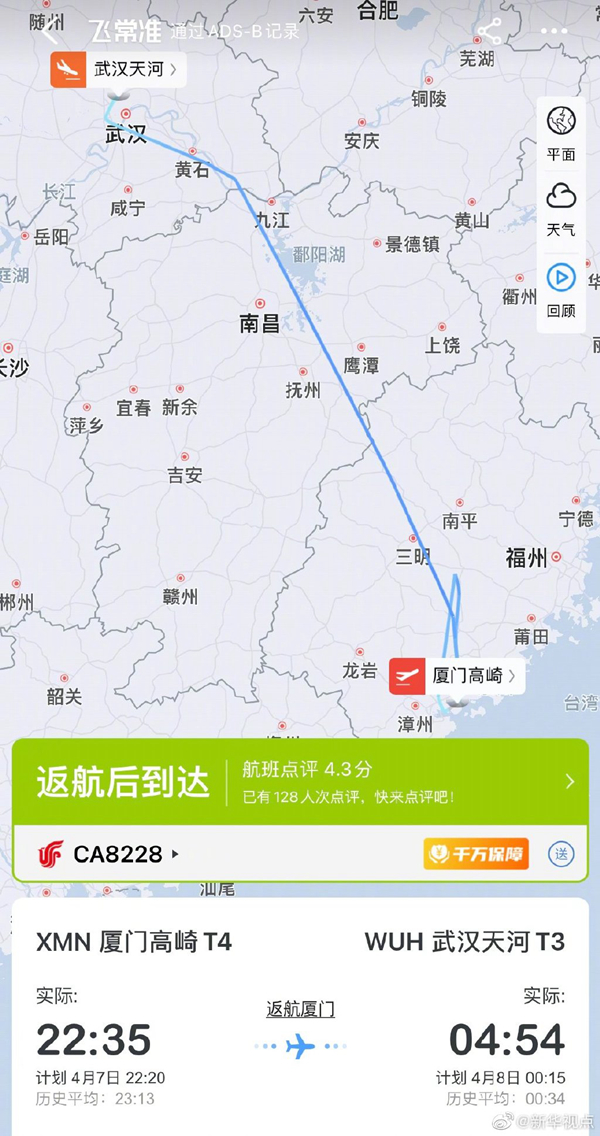 记者从厦门市有关部门获悉,国航CA8228航班于4月7日晚10时35分起飞后,有乘客在机舱中声称“机上有炸弹”,随后该航班返航厦门高崎国际机场。经警方现场检查,未在飞机上发现爆炸物,出警民警将该乘客带回公安机关做进一步调查。随后,航班重新起飞。第三方航班信息软件显示,该航班已于8日4时54分抵达武汉天河国际机场。(记者颜之宏、付敏)
