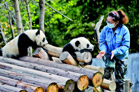 在陕西省林业科学院秦岭大熊猫繁育研究中心,工作人员与大熊猫互动。 新华社资料片