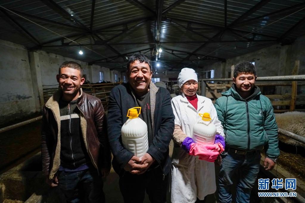 在新疆和田皮山县阔什塔格镇加依纳古特村,布威萨热·阿卜杜杰力(右二)等展示收获的驴奶(2月4日摄)。新华社记者 赵戈 摄