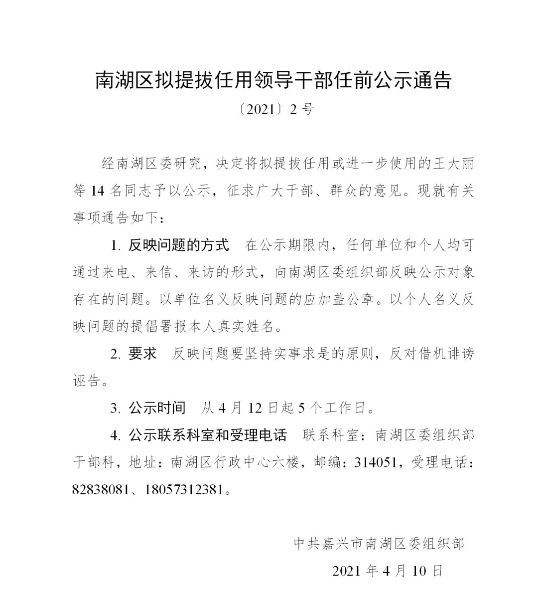 嘉兴市南湖区拟提拔任用领导干部任前公示通告