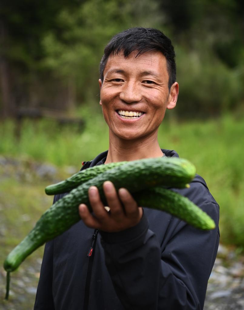 2020年7月30日,西藏山南市隆子县玉麦乡村民展示大棚里采摘的黄瓜,这些黄瓜将通过合作社销往各地。(新华社记者普布扎西摄)