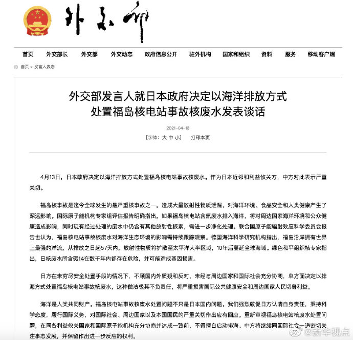 4月13日,日本政府决定以海洋排放方式处置福岛核电站事故核废水。作为日本近邻和利益攸关方,中方对此表示严重关切。