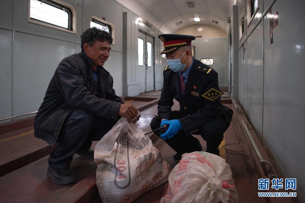 在5633次列车的“行李车厢”内,中国铁路成都局集团公司成都客运段5633/5634次列车长刘伟(右)了解村民携带牲畜情况(4月11日摄)。新华社记者 胥冰洁 摄