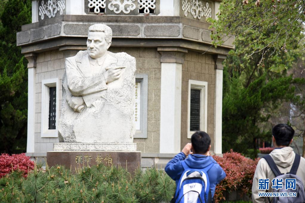 春日的山东临沂华东革命烈士陵园,绿意盎然。在众多的英烈纪念碑中,一座外国人雕像引人注目。