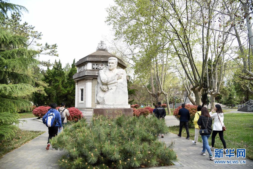 4月13日,游客在山东临沂华东革命烈士陵园瞻仰汉斯·希伯墓。新华社记者 王凯 摄