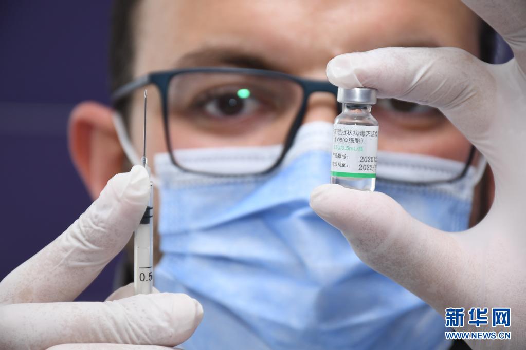 这是2021年1月30日,一名医务人员在摩洛哥西迪卡塞姆一处疫苗接种站展示中国国药的新冠灭活疫苗。新华社发(查迪摄)