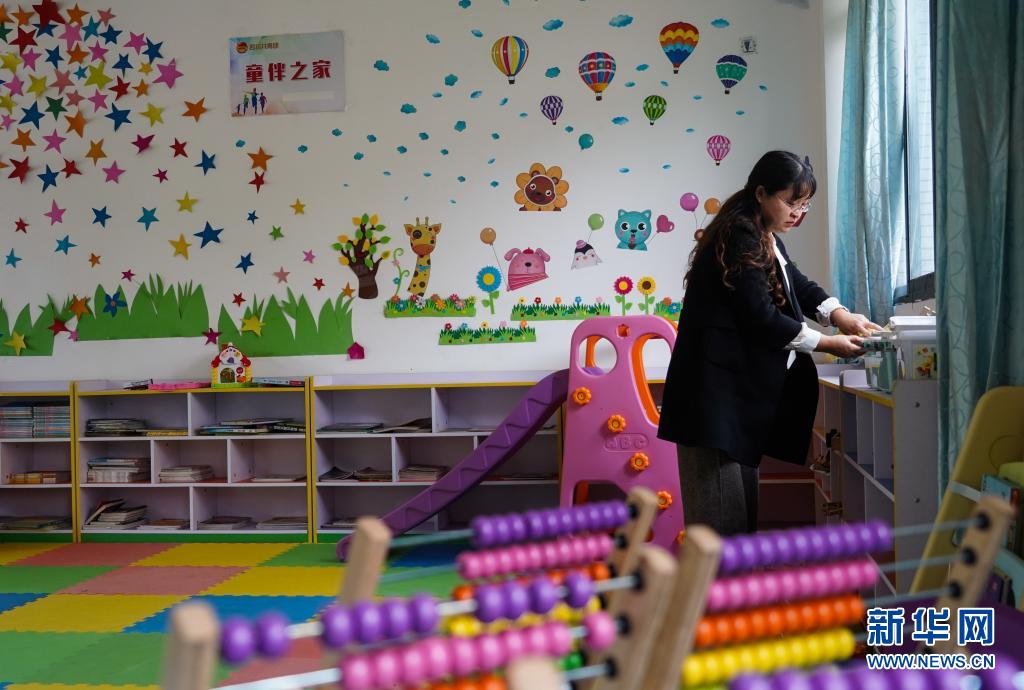 袁文娟在芦山县“友好家园”儿童活动室整理学习用品(4月13日摄)。新华社记者 王曦 摄