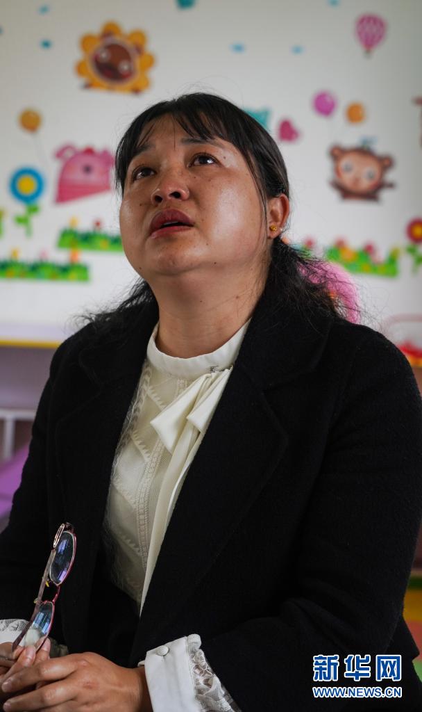 在芦山县“友好家园”儿童活动室,袁文娟谈起父亲袁超时眼含热泪(4月13日摄)。新华社记者 王曦 摄