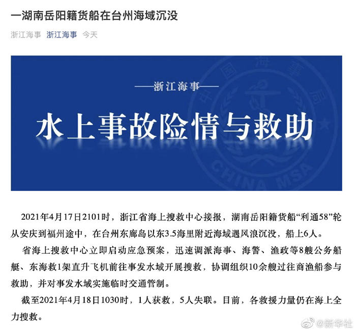 据“浙江海事”微信公众号消息,2021年4月17日21:01,浙江省海上搜救中心接报,湖南岳阳籍货船“利通58”轮从安庆到福州途中,在台州东廊岛以东3.5海里附近海域遇风浪沉没,船上6人。