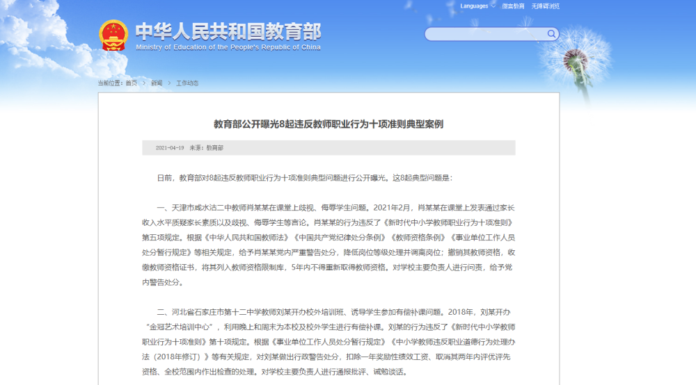 日前,教育部对8起违反教师职业行为十项准则典型问题进行公开曝光。这8起典型问题是: