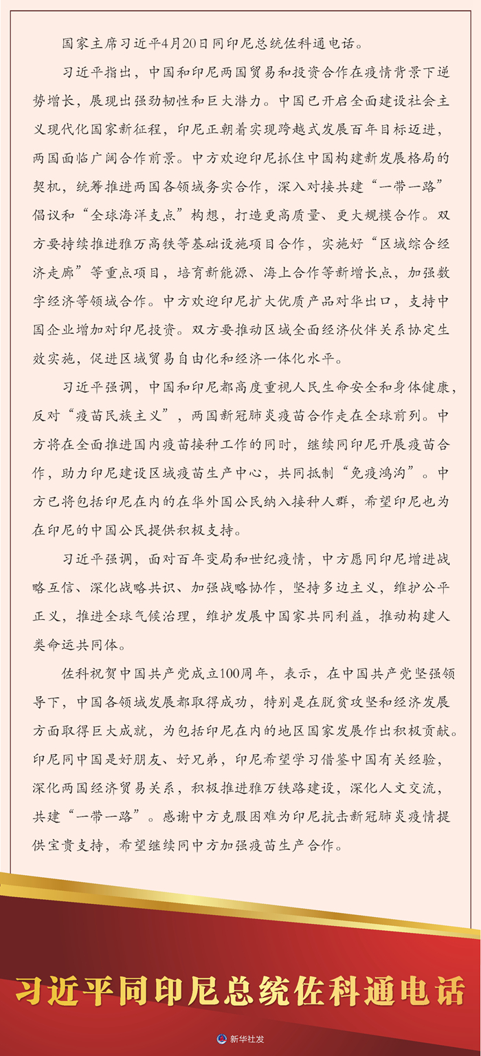 新华社北京4月20日电 国家主席习近平4月20日同印尼总统佐科通电话。