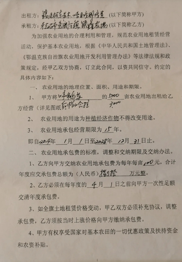 鄂温克旗一些种植户用地租赁合同已签至2028年