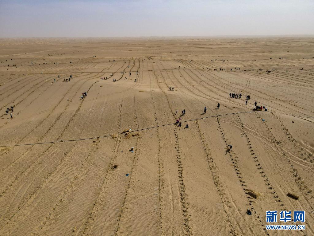 这是在新疆且末县城不远处的塔克拉玛干沙漠内植树的群众(3月28日摄,无人机照片)。新华社记者 高晗 摄