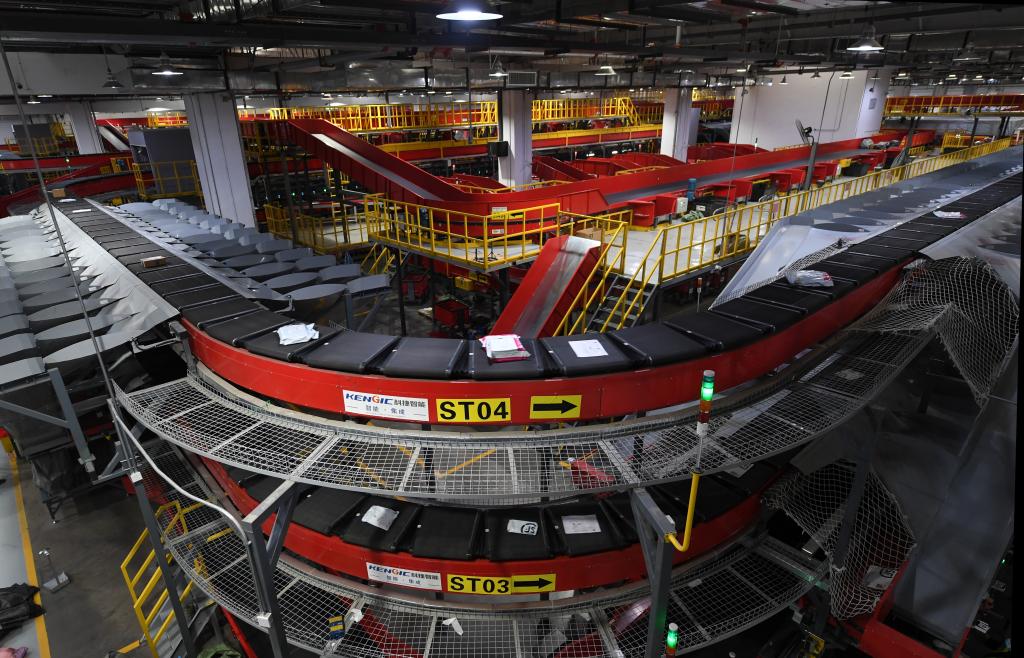 快递在顺丰天津全自动中转枢纽内的全自动分拣设备上传输。(新华社记者赵子硕摄)