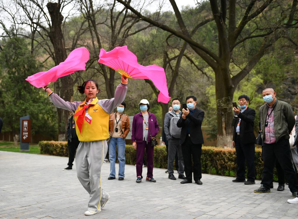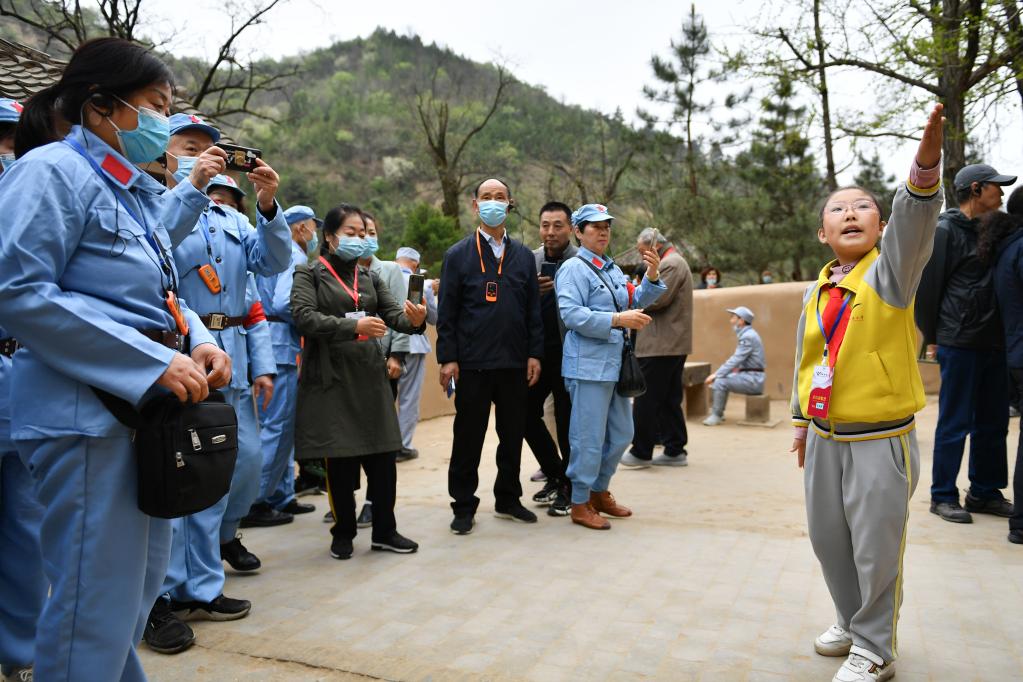 延安新新双语小学学生用表演形式为游客讲解。(新华社记者张博文2021年4月22日摄)