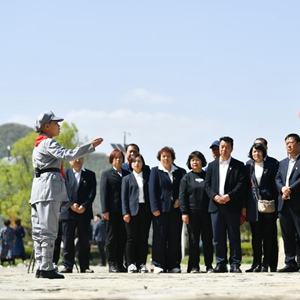 宋天翊(左一)在为游客讲解。(新华社记者张博文2021年4月18日摄)
