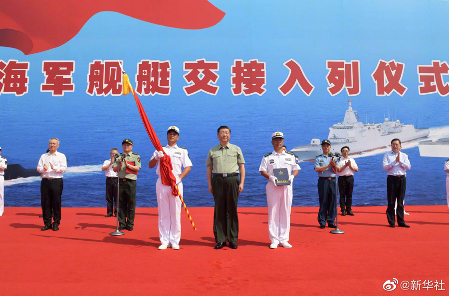 海军三型主战舰艇——长征18号艇、大连舰、海南舰23日在海南三亚某军港集中交接入列。中共中央总书记、国家主席、中央军委主席习近平出席交接入列活动。(记者李宣良、李刚)