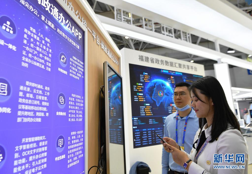 4月25日,在第四届数字中国建设峰会数字成果展览会上,观众在参观福建省政务数据汇聚共享平台展示的闽政通办公APP。新华社记者 魏培全 摄