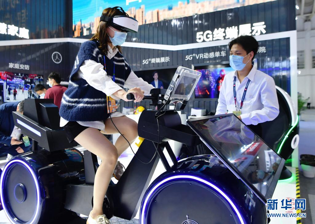 4月25日,在第四届数字中国建设峰会数字成果展览会上,一名观众在体验基于5G技术的VR动感单车。新华社记者 魏培全 摄