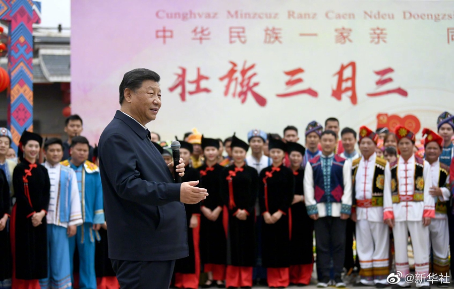 27日上午,正在广西南宁考察的习近平总书记来到广西民族博物馆,了解壮族历史、文化习俗等情况。博物馆外,正在举办三月三“歌圩节”民族文化活动,习近平不时驻足观看,向大家挥手致意,为大家鼓掌。习近平高兴地说,广西这些年发展进步很大,脱贫攻坚任务顺利完成了,630多万人脱贫。我说过,脱贫路上一个也不能少,一个民族都不能少。中国人说话、中国共产党说话、中国共产党的领导说话是算数的。现在全中国56个民族都脱贫了,兑现了我们的庄严承诺。我们还不能停步,接下来要向着第二个百年奋斗目标新征程迈进,一个民族也不能少,加油、努力,再长征!(文字记者:张晓松、朱基钗;摄影记者:鞠鹏、谢环驰、申宏)