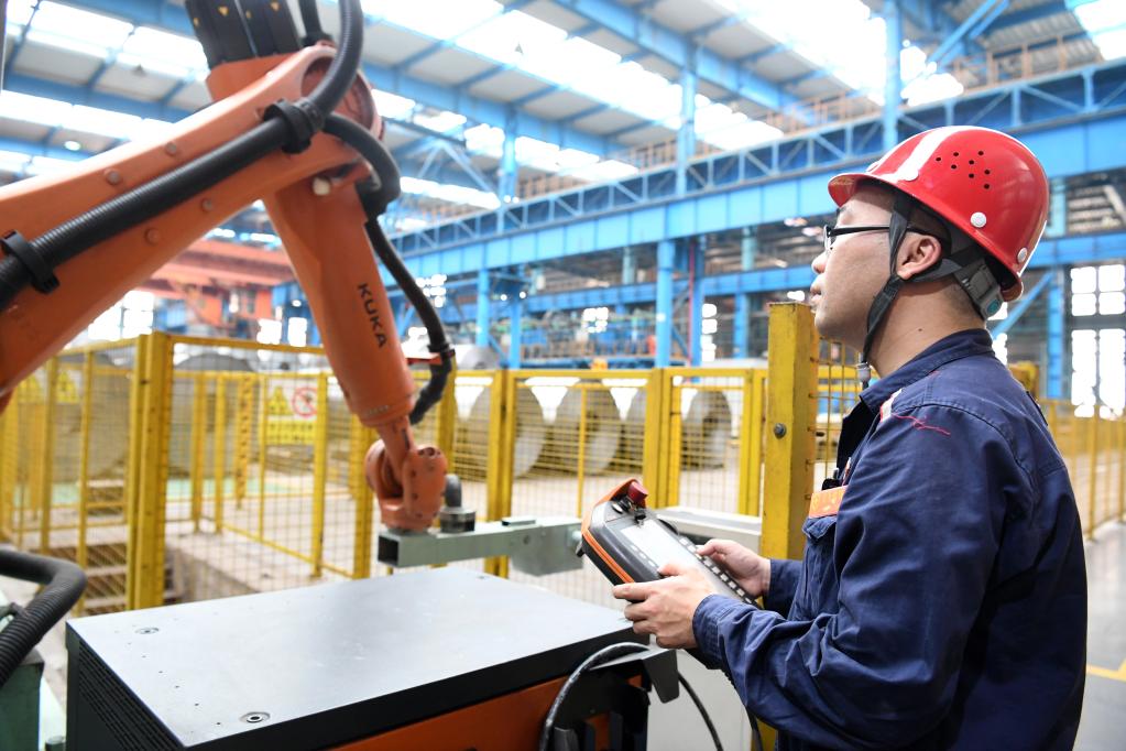 在柳钢集团冷轧厂生产车间,技术工人汤龙波检查工业机器人运行情况。(黎寒池摄)