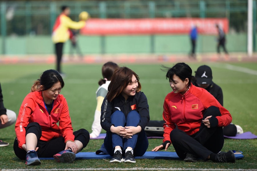 △甜甜(前中)在陆地训练间隙与队友交流(2021年4月26日摄)。