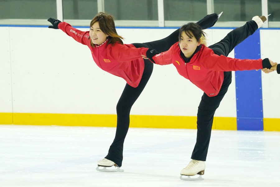 △甜甜(左)在花样滑冰馆进行队列滑训练(2021年4月26日摄)。