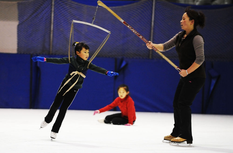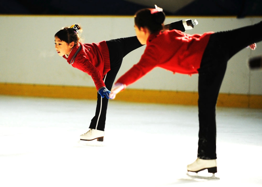 △ 甜甜(左)在进行花滑晨训(2009年11月1日摄)。