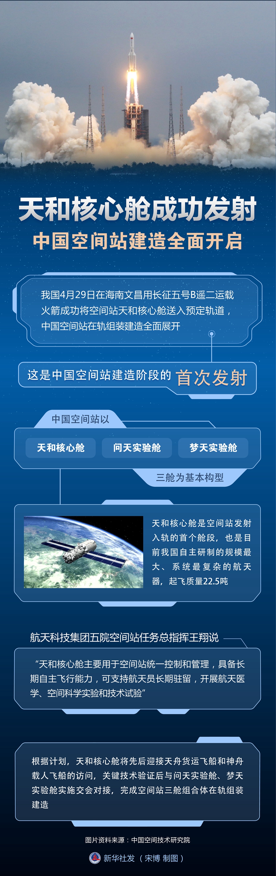 “天和核心舱主要用于空间站统一控制和管理,具备长期自主飞行能力,可支持航天员长期驻留,开展航天医学、空间科学实验和技术试验。”航天科技集团五院空间站任务总指挥王翔说。