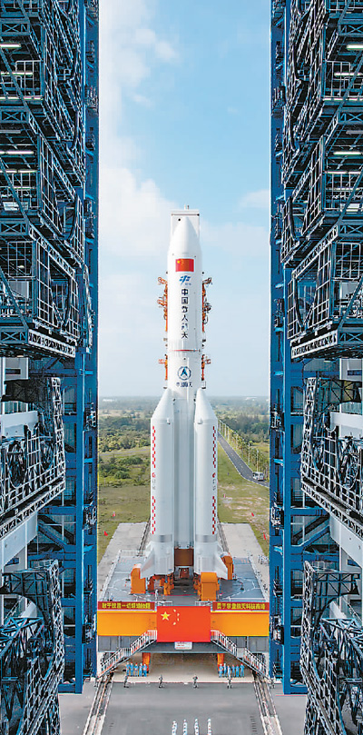 位于发射区的空间站天和核心舱与长征五号B遥二运载火箭组合体。