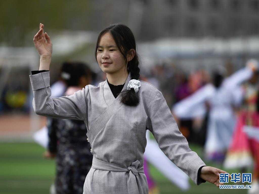 4月28日,在(西宁)果洛中学,周毛在跳锅庄。新华社记者 张龙 摄