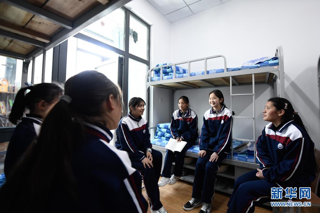 4月28日,在(西宁)果洛中学,周毛(右二)和同学在宿舍聊天。新华社记者 张龙 摄