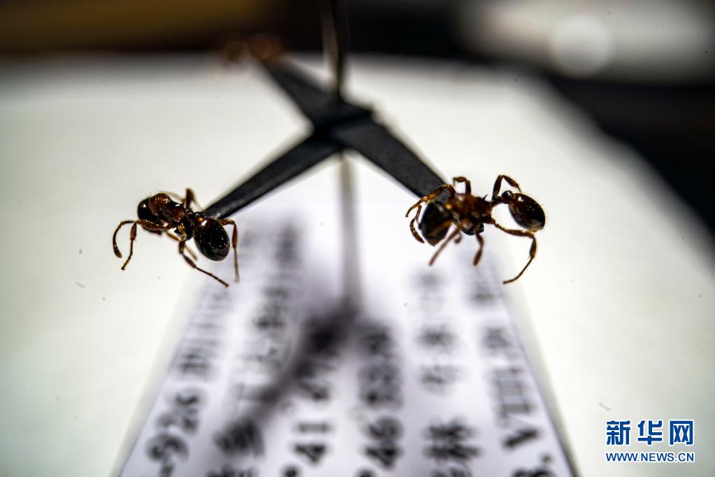 在徐正会的蚂蚁标本实验室,记者见到了被钉在盒子里的红火蚁标本。