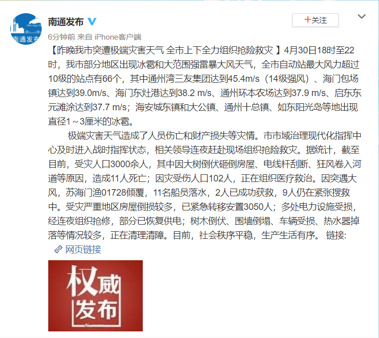 极端灾害天气造成了人员伤亡和财产损失等灾情。南通市市域治理现代化指挥中心及时进入战时指挥状态,相关领导连夜赶赴现场组织抢险救灾。据统计,截至目前,受灾人口3000余人,其中因大树倒伏砸倒房屋、电线杆刮断、狂风卷入河道等原因,造成11人死亡;因灾受伤人口102人,正在组织医疗救治。因突遇大风,苏海门渔01728倾覆,11名船员落水,2人已成功获救,9人仍在紧张搜救中。受灾严重地区房屋倒损较多,已紧急转移安置3050人;多处电力设施受损,经连夜组织抢修,部分已恢复供电;树木倒伏、围墙倒塌、车辆受损、热水器掉落等情况较多,正在清理清障。目前,社会秩序平稳,生产生活有序。(来源:南通发布微博)