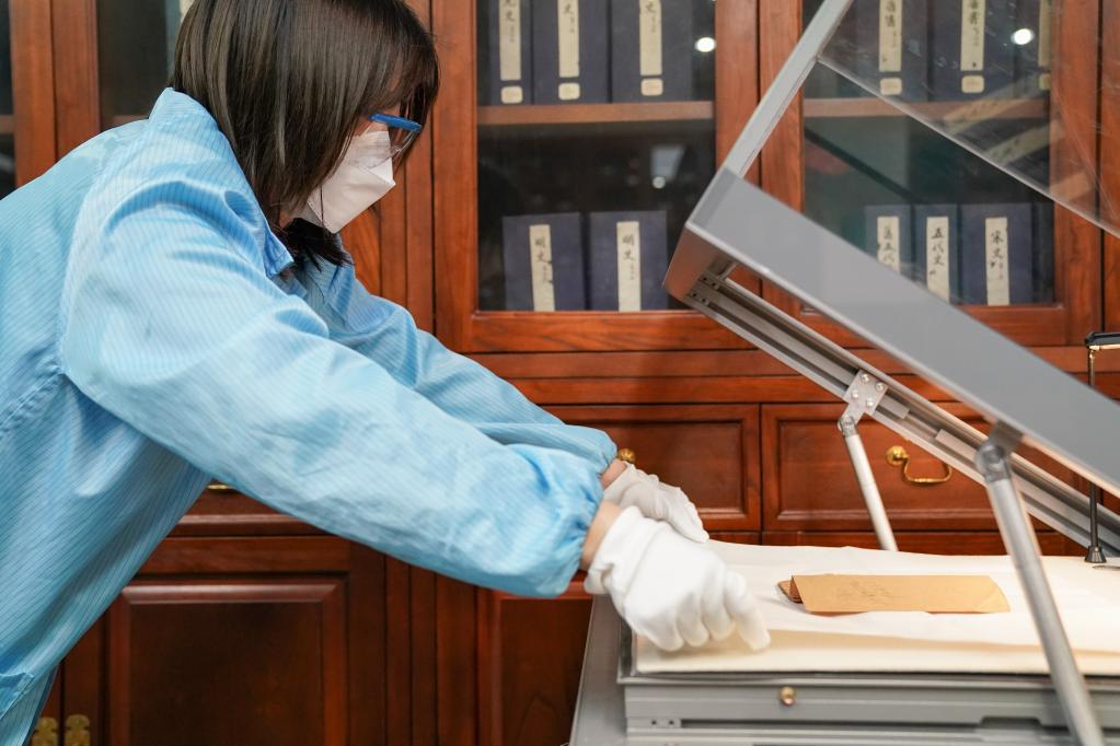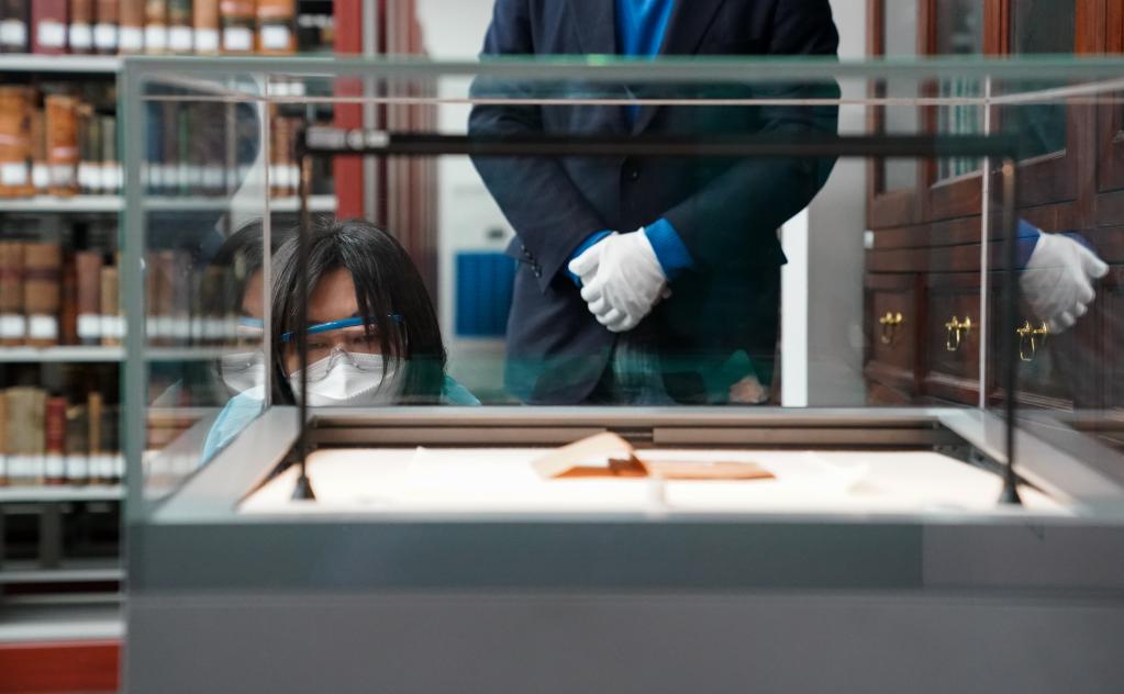 在上海社会科学院图书馆特藏室,古籍修复师成雯吉从高气密性恒温恒湿展柜中取出《共产党宣言》中文全译本。
