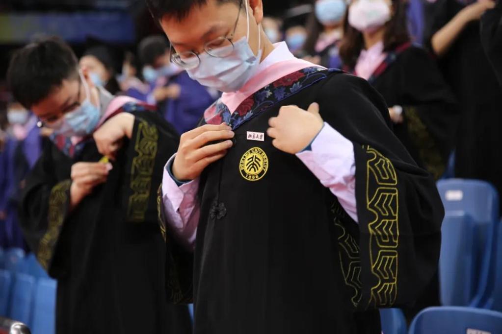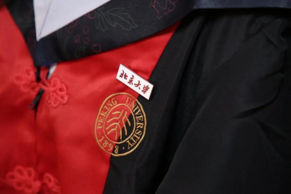 毕业生们还集体佩戴了学校特别为他们定制的校徽。校徽的背面,镌刻了“学位授予仪式留念”字样。此后,“北京大学”将成为他们一生的印记。