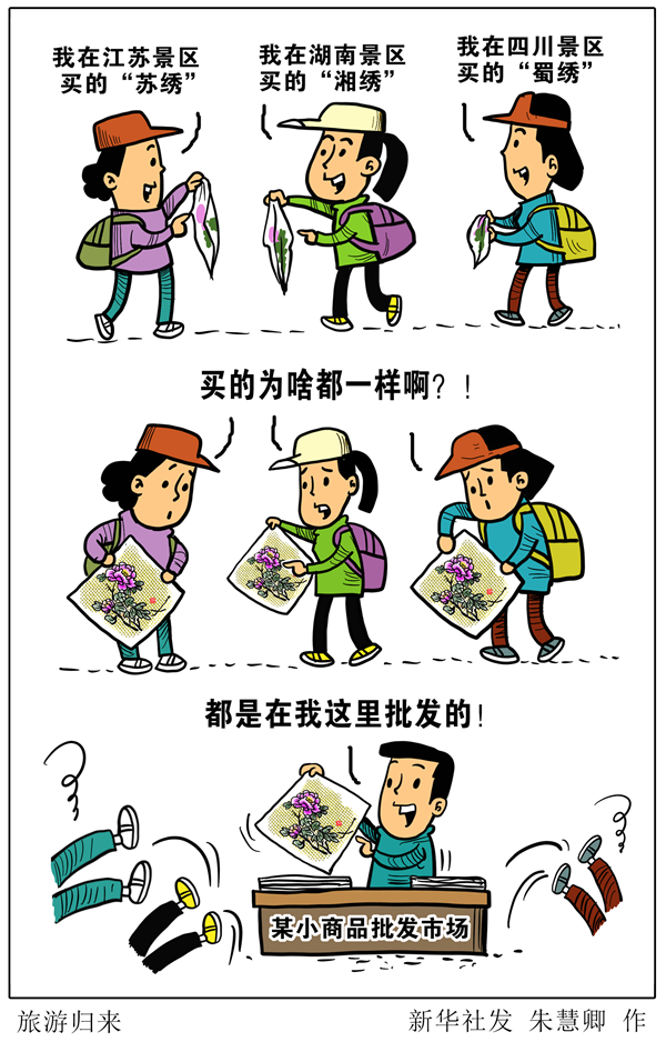 刚刚过去的“五一”小长假,各地景点人气爆棚,国内旅游收入超千亿元,游客满意度总体较高,但不少游客也表示存在遗憾:一些景区卖的所谓“纪念品”大同小异,不仅梳子、手串、披肩、海螺四处可见,更有甚者,一块普通绣花手帕,在江苏景区里是“苏绣”,在湖南景区就成了“湘绣”,到了四川又被唤作“蜀绣”,其实它们可能都来自某一个小商品批发市场。