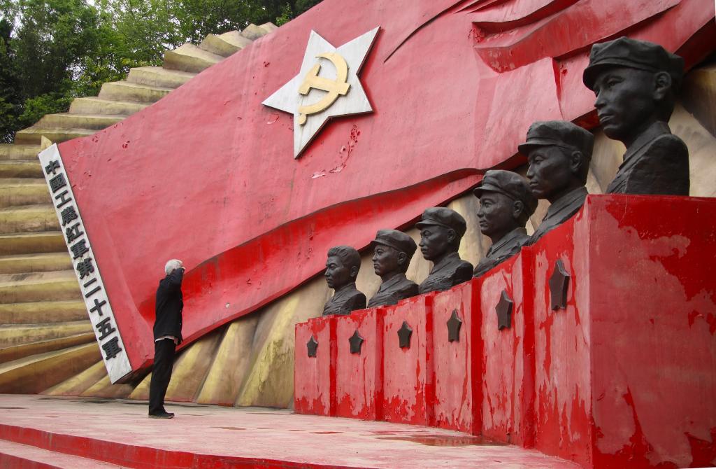 在河南省信阳市光山县文殊乡花山寨,王茂贵在红二十五军旗帜下向雕像敬军礼(4月23日摄)。新华社发