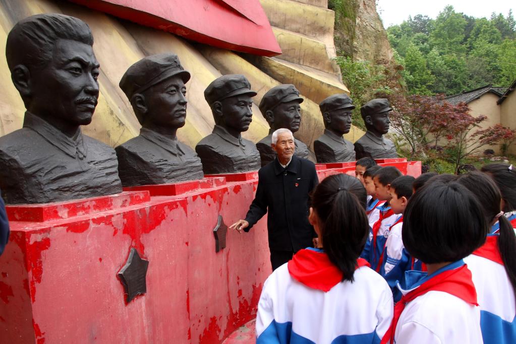 在河南省信阳市光山县文殊乡花山寨,王茂贵(左一)给小学生讲述红军故事(4月23日摄)。新华社发
