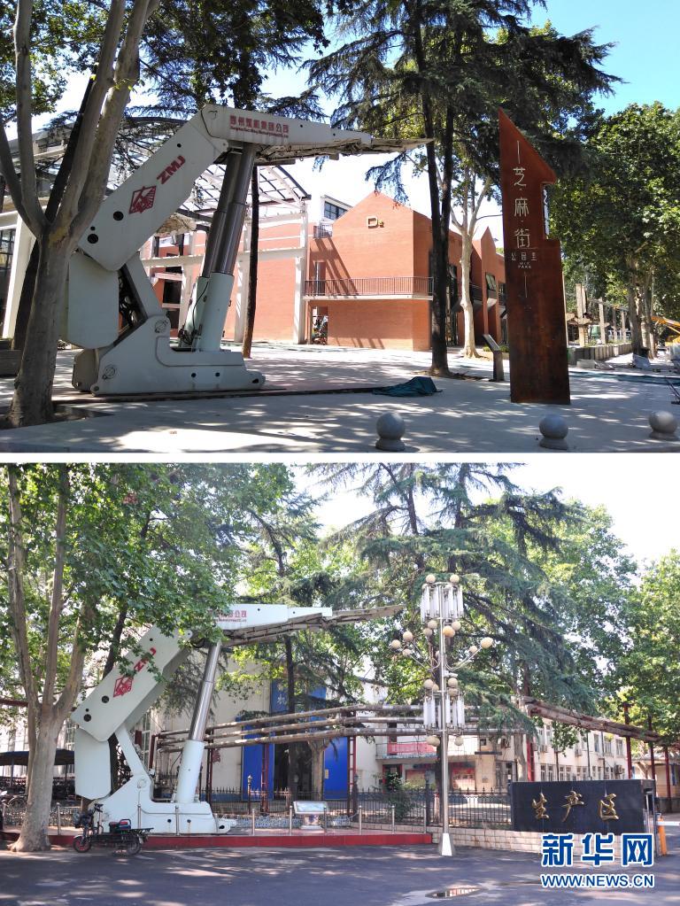 这是一张拼版照片:改造后(上图)和改造前(下图)的河南郑州芝麻街1958双创园一角(资料照片)。新华社发
