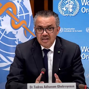 这是世界卫生组织总干事谭德塞5月7日在瑞士日内瓦出席新闻发布会的视频截图。新华社发