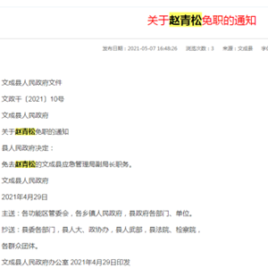 其中,涉事男子被证实为浙江省温州市文成县应急管理局副局长赵青松。澎湃新闻注意到,文成县政府网站5月7日刊发的一则通知显示,文成县政府已于4月29日决定免去赵青松的文成县应急管理局副局长职务。