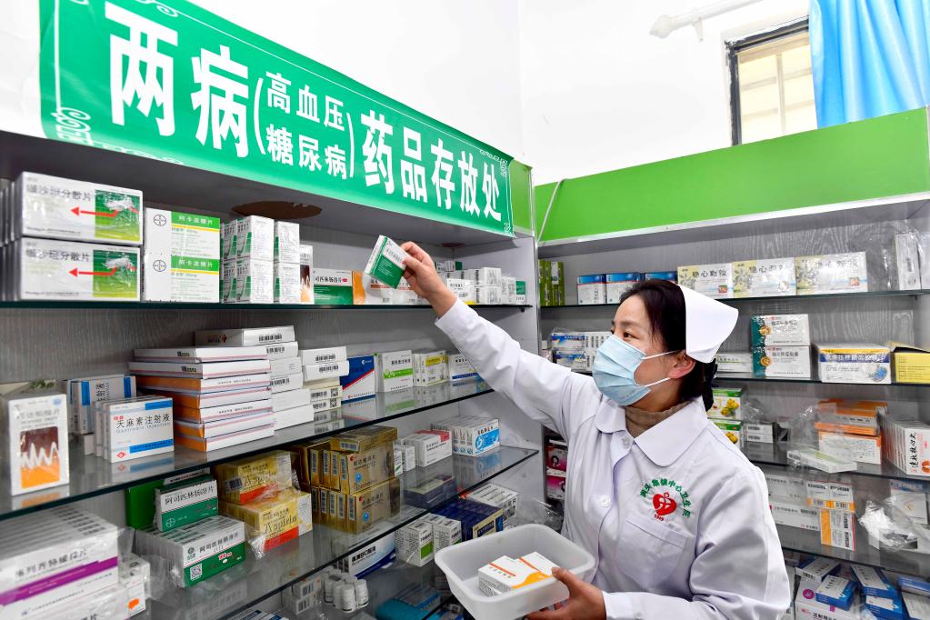 2020年10月29日,在枣庄市台儿庄区涧头集镇中心卫生院,工作人员在取药。新华社记者郭绪雷摄