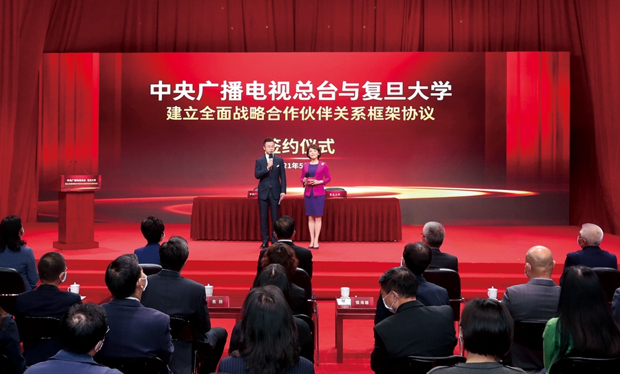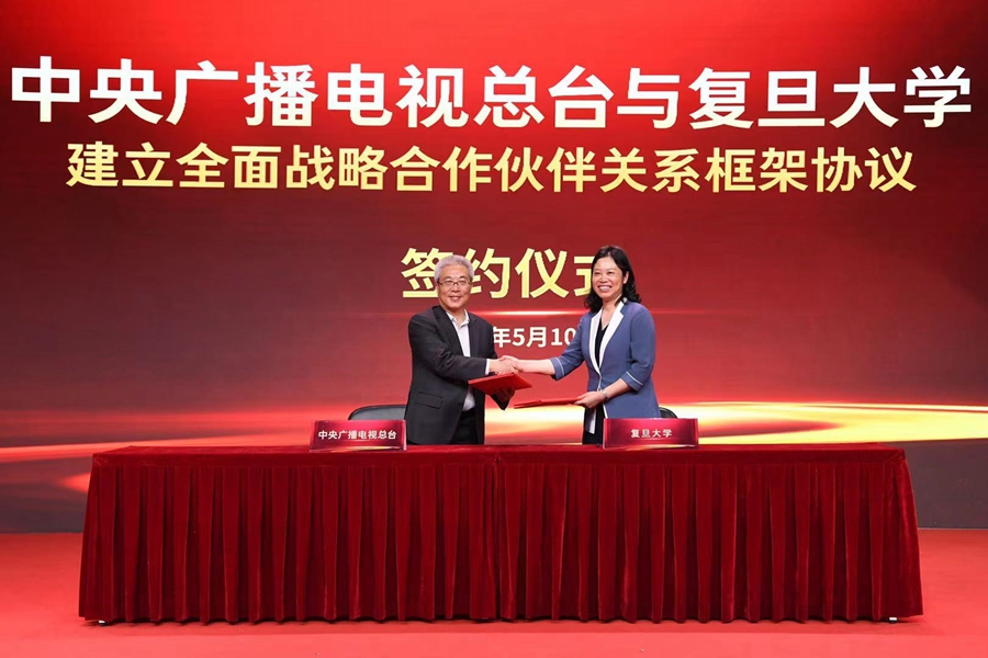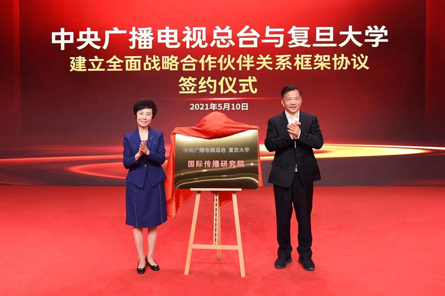 5月10日,中央广播电视总台与复旦大学签订全面战略合作伙伴关系框架协议仪式在北京举行。中宣部副部长、中央广播电视总台台长兼总编辑慎海雄,复旦大学党委书记焦扬出席签约仪式并致辞。中央广播电视总台编务会议成员黄传芳和复旦大学党委副书记许征代表双方签约。慎海雄和焦扬共同为中央广播电视总台—复旦大学国际传播研究院揭牌。