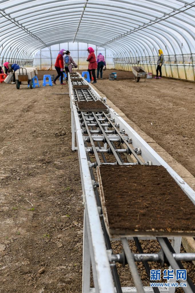 在吉林省吉林市永吉县九月丰家庭农场,水稻育秧生产线将种好种子的秧盘送到农民手中(4月13日摄)。新华社记者 张楠 摄